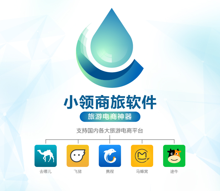 小領(lǐng)商旅軟件,旅游電商神器,國內(nèi)各大旅游電商平臺(tái)(去哪兒,攜程,途牛,飛豬,螞蜂窩...)均可支持:機(jī)票集成,價(jià)格更新,排名分析,價(jià)格對(duì)比,做電商就是這么容易!。